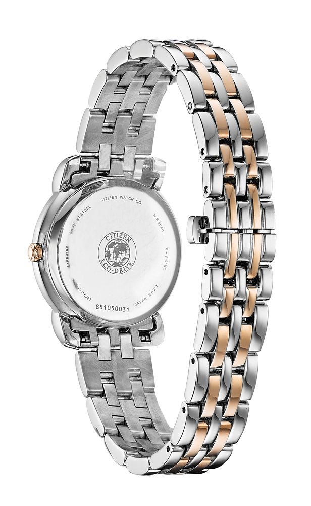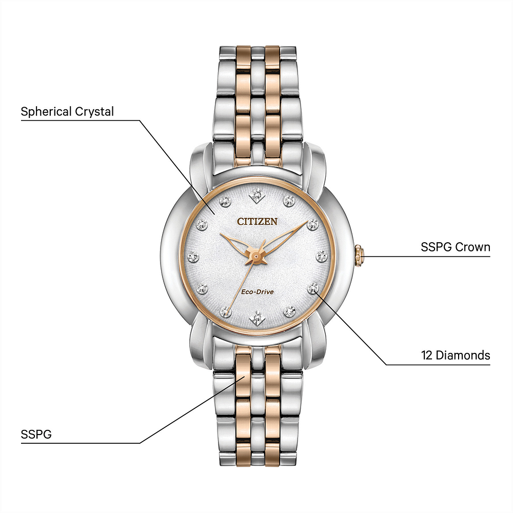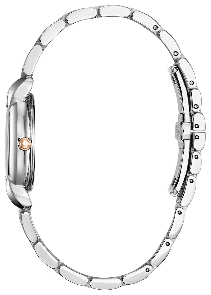 Reminiscent of a 1950s bow, a brand new silhouette for CITIZEN, the Ladies' Jolie timepiece. Featured with brilliant diamonds on the dial, this watch is a perfect match for your LBD. Shown here in two-tone pink gold stainless steel with a pearl white dial. Featuring our Eco-Drive technology – powered by light, any light. Never needs a battery. Caliber number E031.