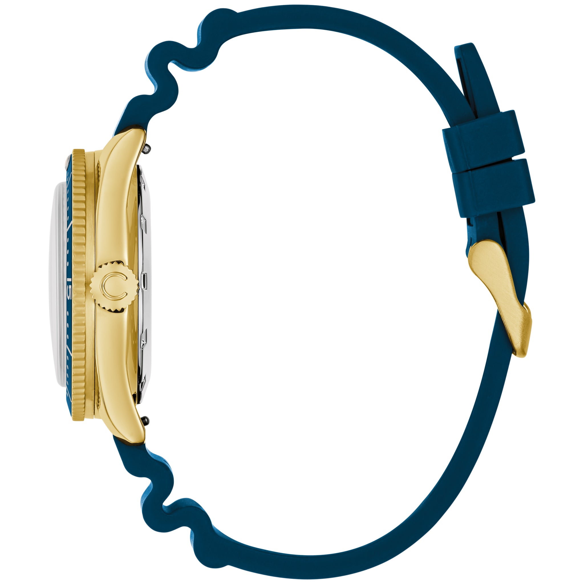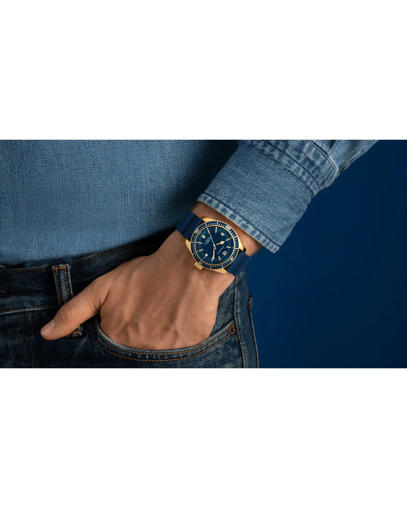 The return of an icon: The men’s Caravelle Sea Hunter is reborn for the modern age. Inspired by one of Caravelle’s most celebrated models, the new Caravelle Sea Hunter is sized for modern tastes at 39mm, with a gold-tone case crafted from 316L stainless steel and echoing the sporting form of the original. Ensuring ideal legibility and functionality, a deep blue dial with a date display and luminescent hands and markers is complemented by a matching rotating 60-minute timing bezel. The Caravelle Sea Hunter is powered by a 21-jewel automatic movement with a power reserve of 42 hours. Paired with rugged blue rubber strap and rated to 200m water resistance, this watch can go wherever you do so you can do whatever you want. Experience an icon remade with the men’s Caravelle Sea Hunter.